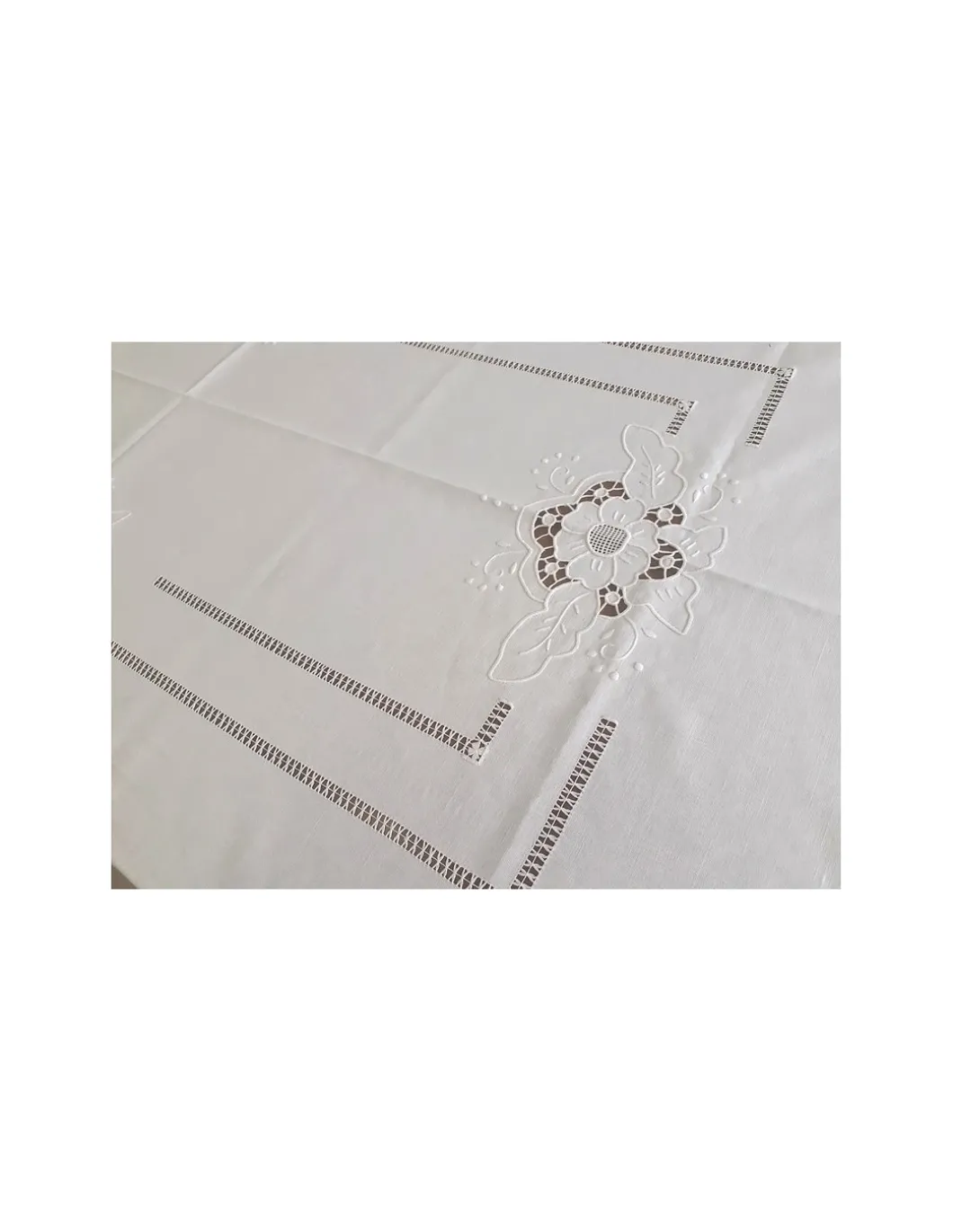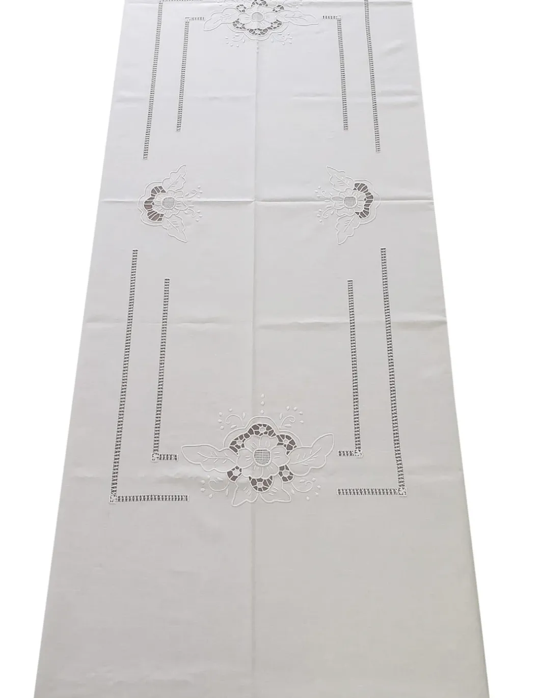 Toalha com os 4 cantos bordados, laterais e centro da mesa.
