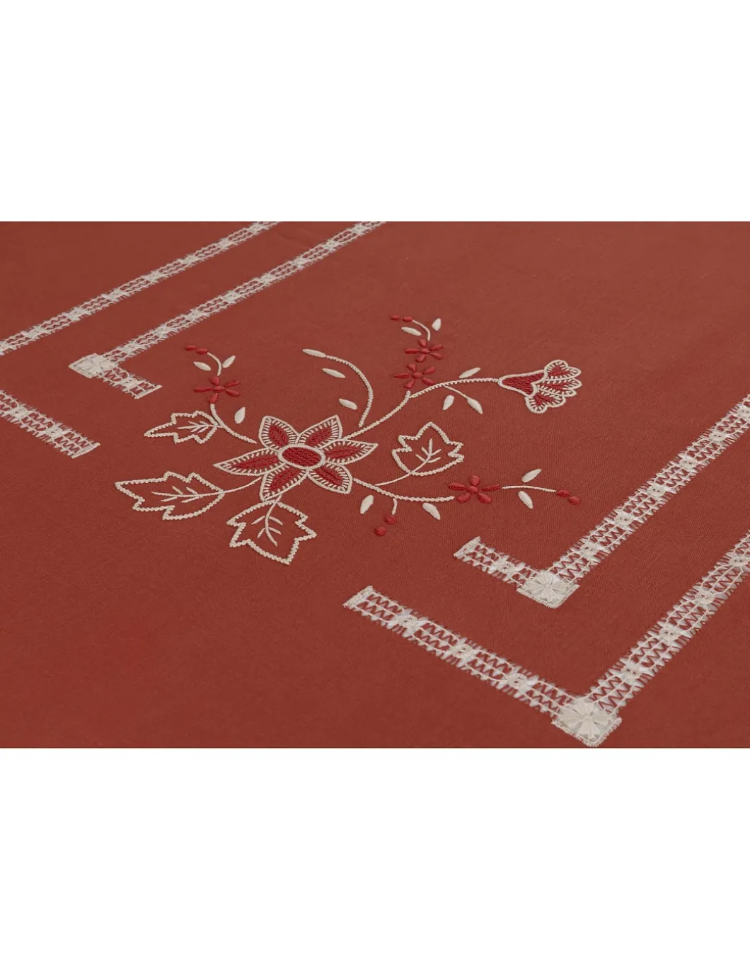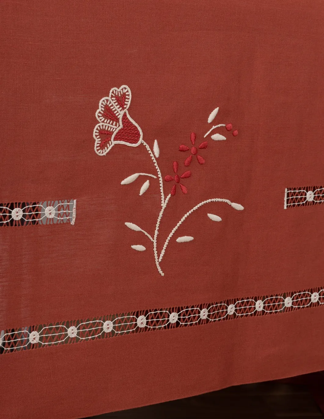 Toalha 100% linho, cor telha. Toalha toda bordada à mão no papelão, com fios de algodão.