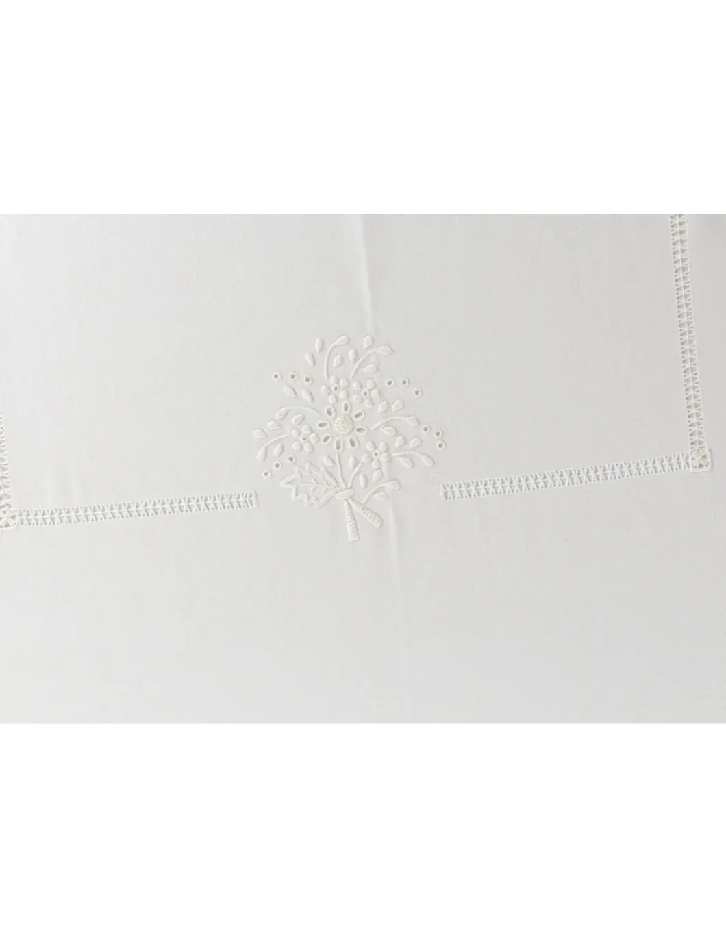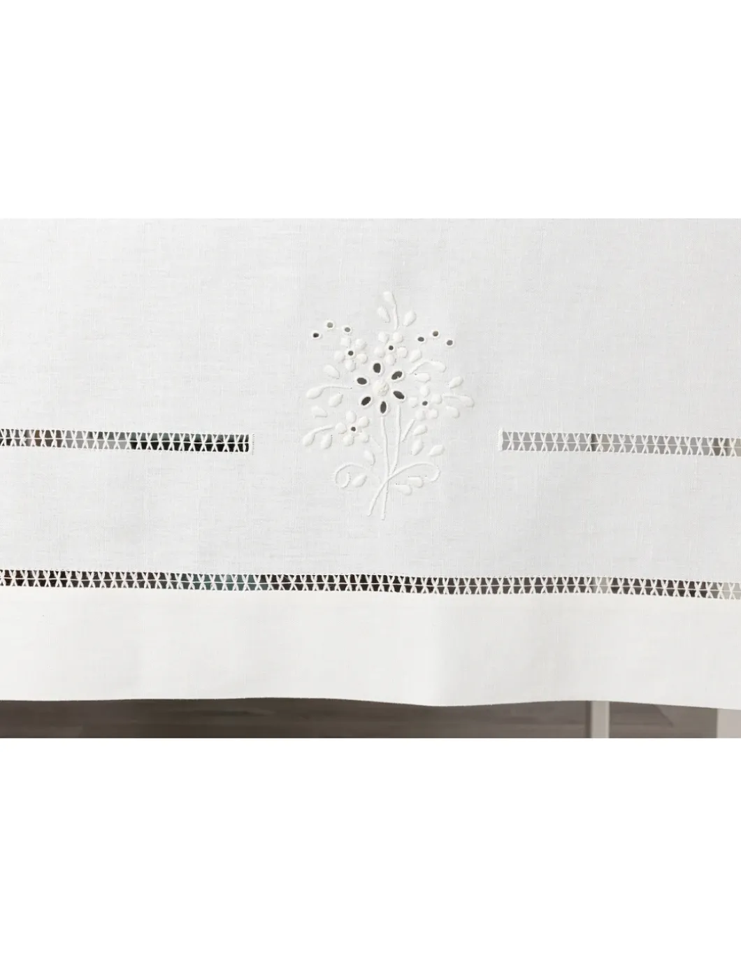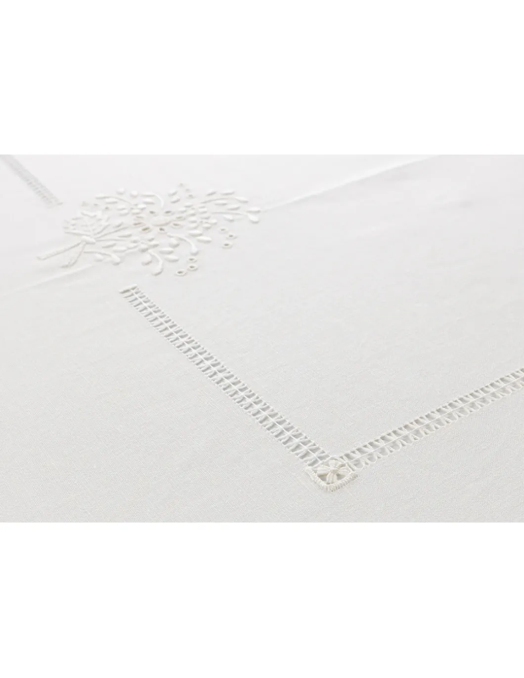 Toalha com os 4 cantos bordados, centro da mesa, laterais e topos.