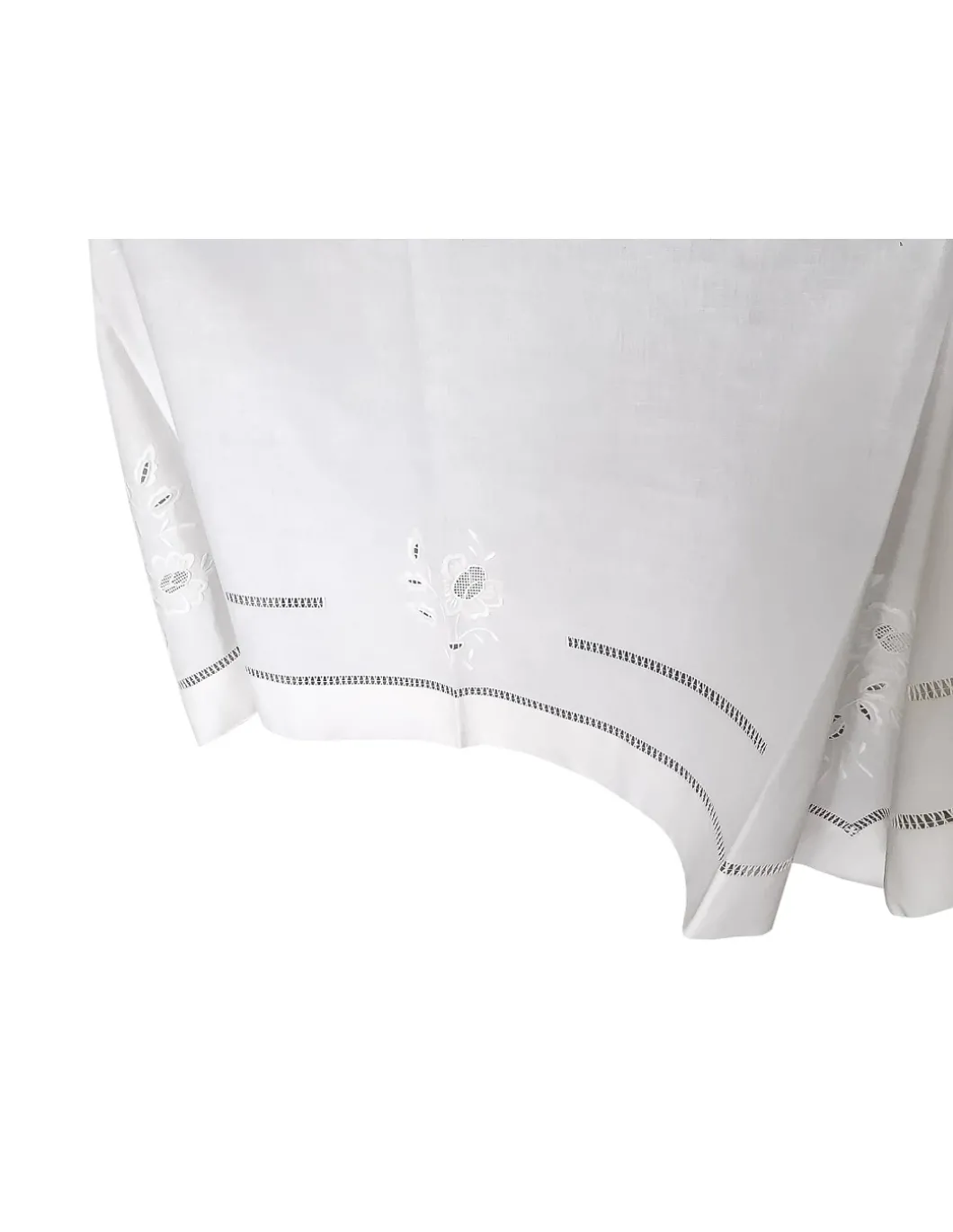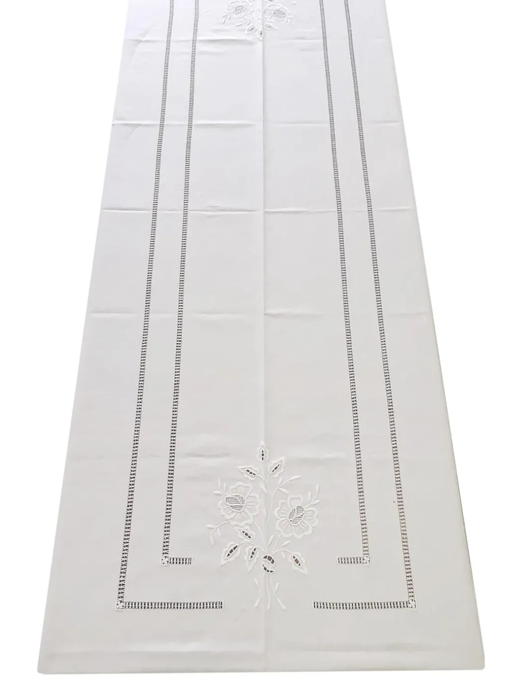 Toalha com os 4 cantos bordados, centro da mesa, laterais e topos.