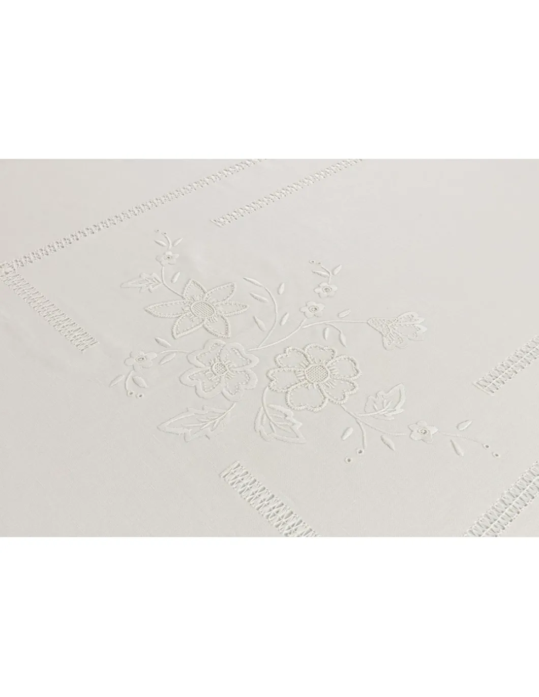 Toalha com os 4 cantos bordados, centro da mesa, laterais e topos.