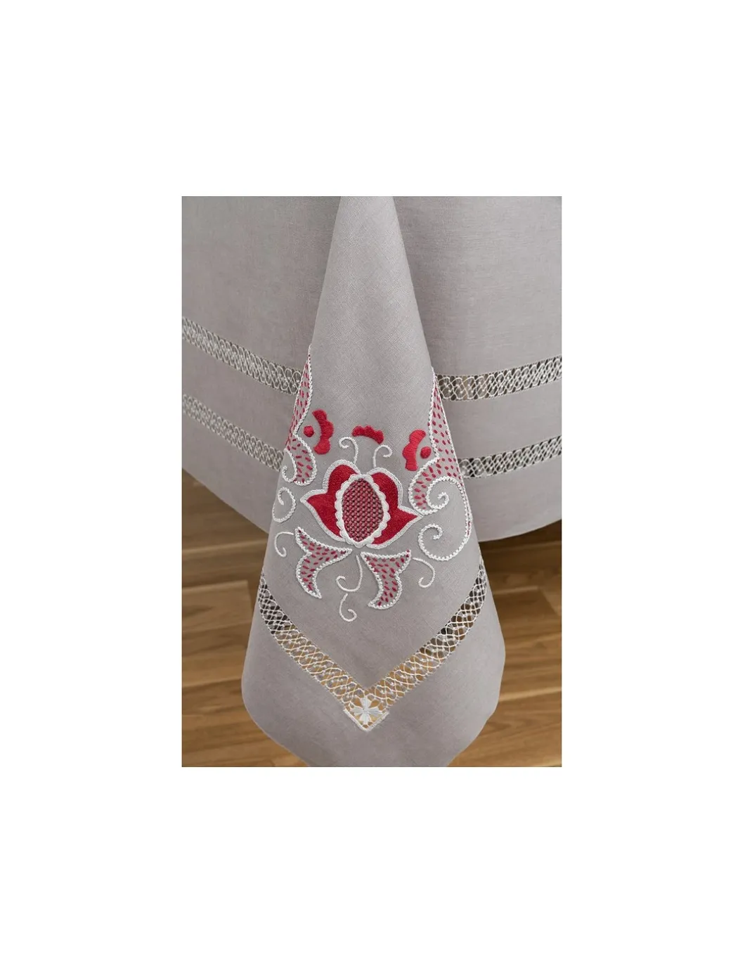 Toalha com os 4 cantos bordados, centro da mesa e laterais.