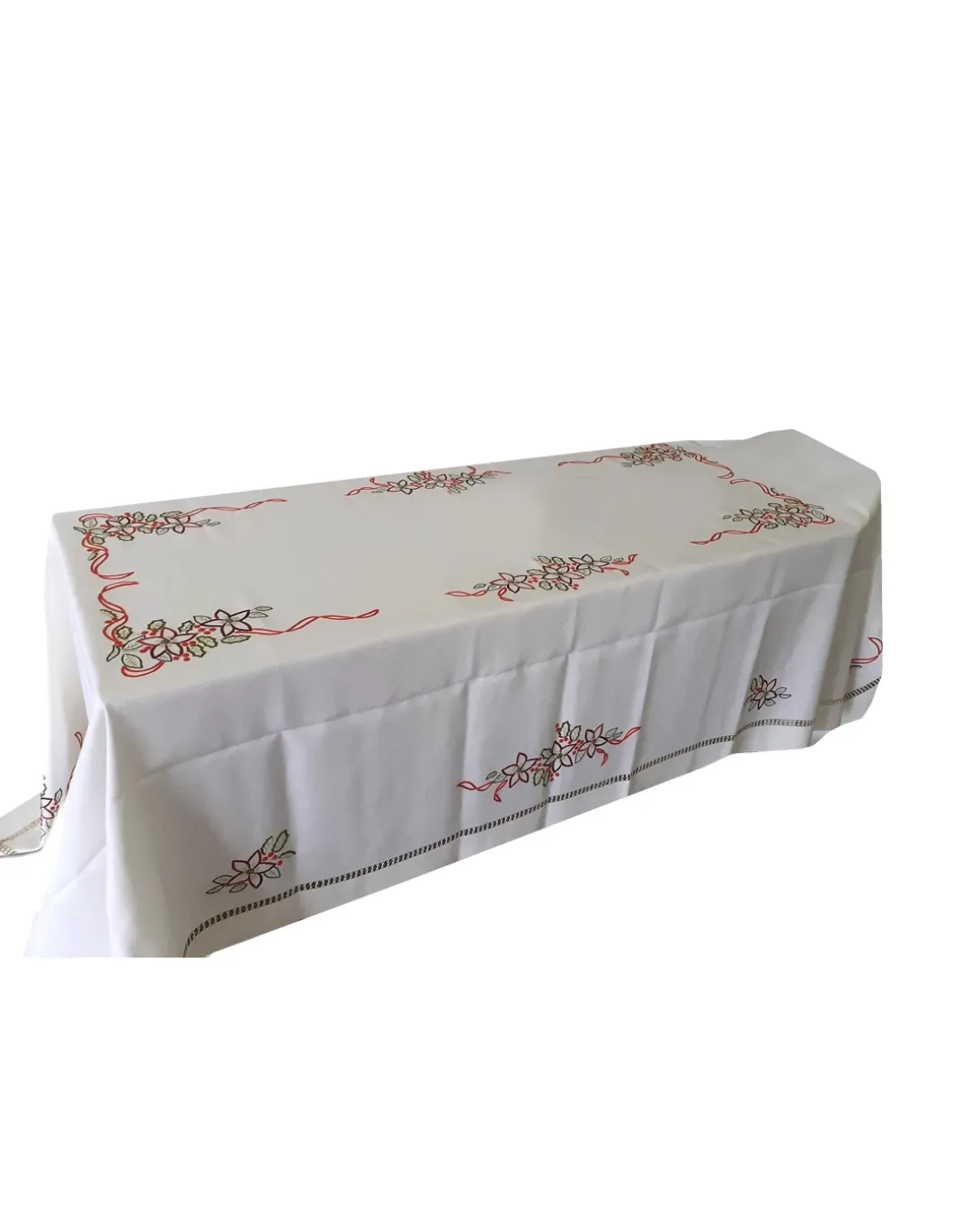 Toalha com os 4 cantos bordados, centro da mesa, esquinas e topos.
