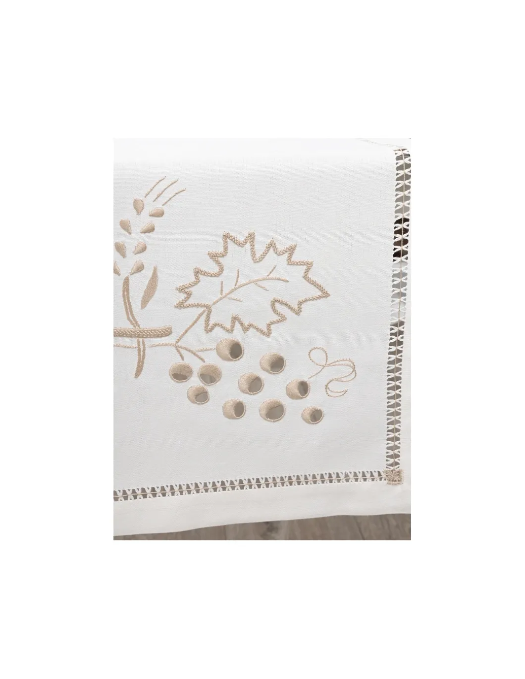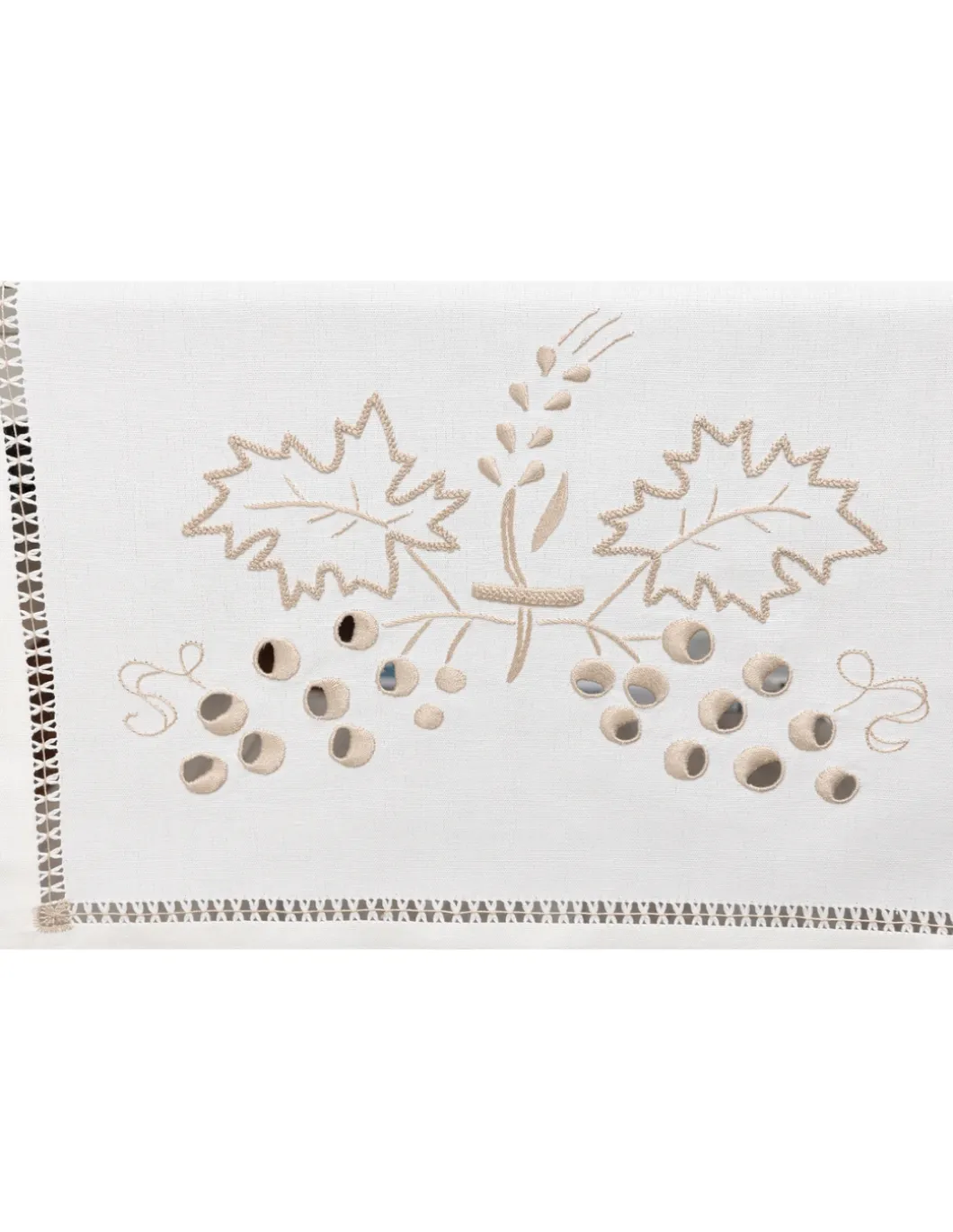 Caminho de mesa 60% linho nacional 40% algodão, peça bordada à mão no papelão, com fios de algodão de cor. Ponto aberto (Bainha de molhos) a toda a volta do tecido.