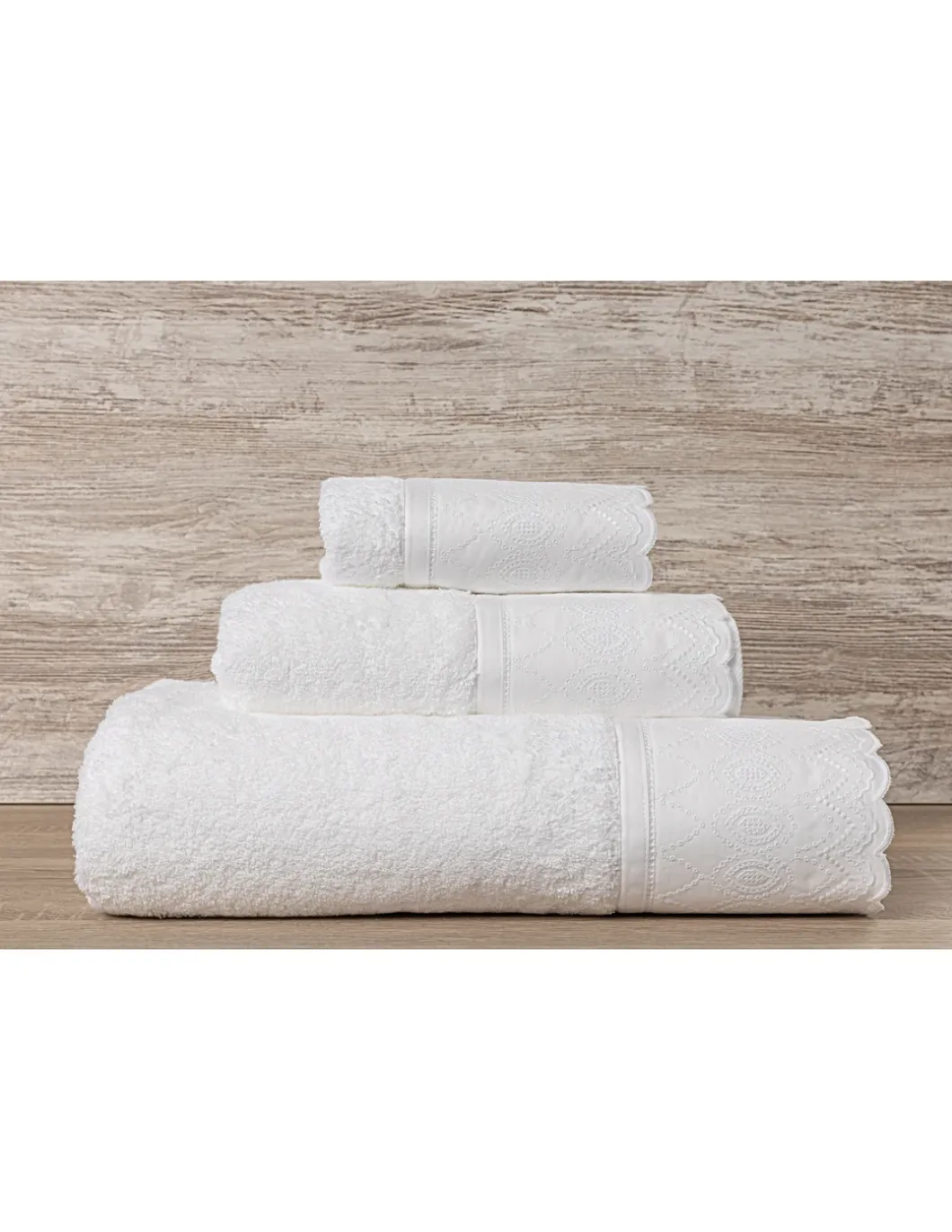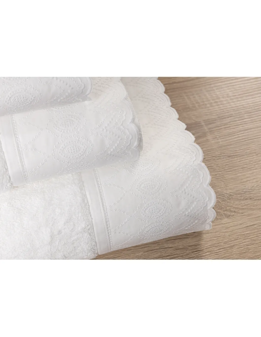 Toalhas de felpo branco com bordado branco.
