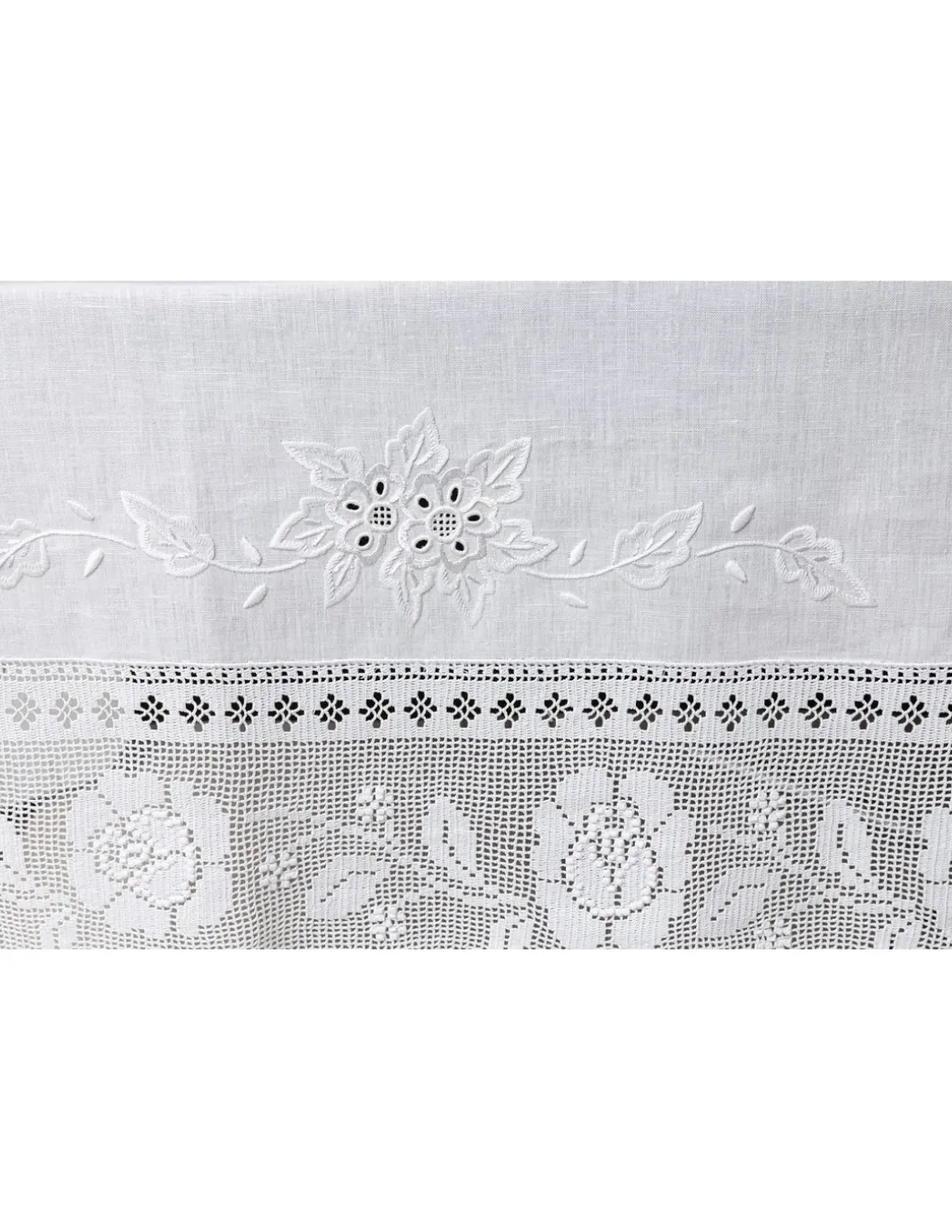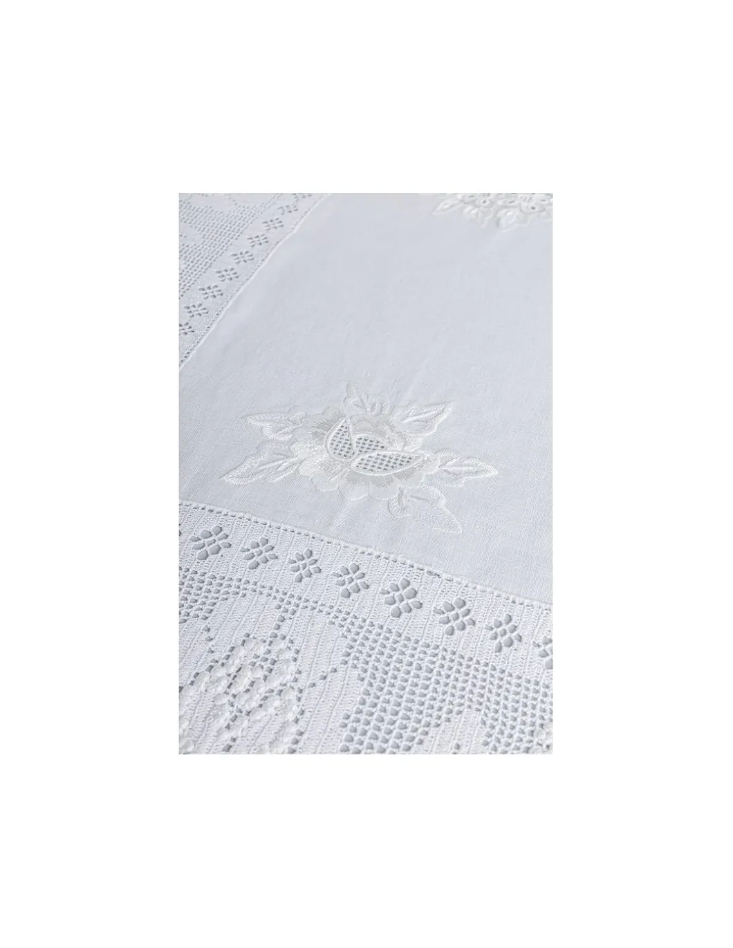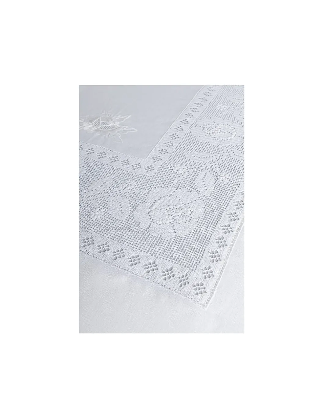Toalha bordada a ponto cheio, crivo e outros. Crochê aplicado a toda a volta da toalha e centro da toalha.