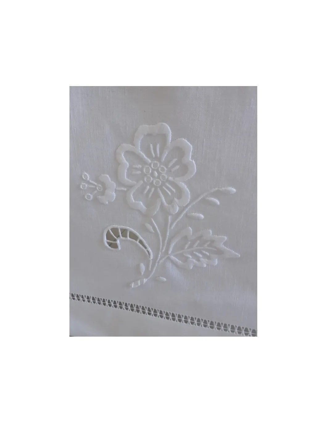 Toalha toda bordada à mão no papelão, richelieu e bainha de molhos a toda a volta da toalha