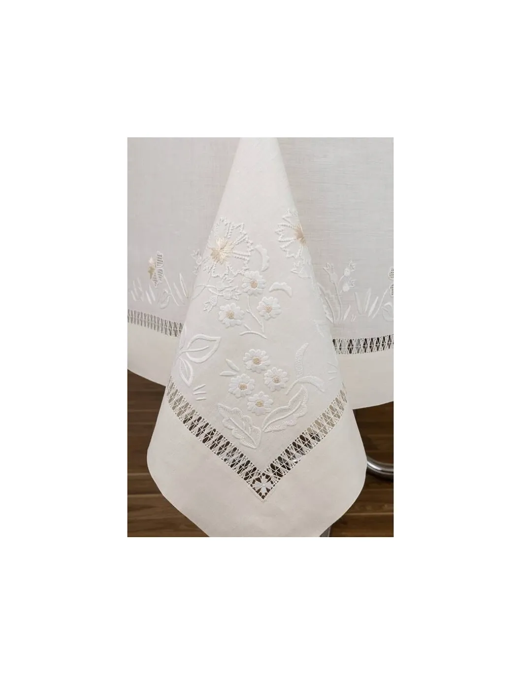 Toalha com os 4 cantos bordados, centro da mesa, laterais e topos.