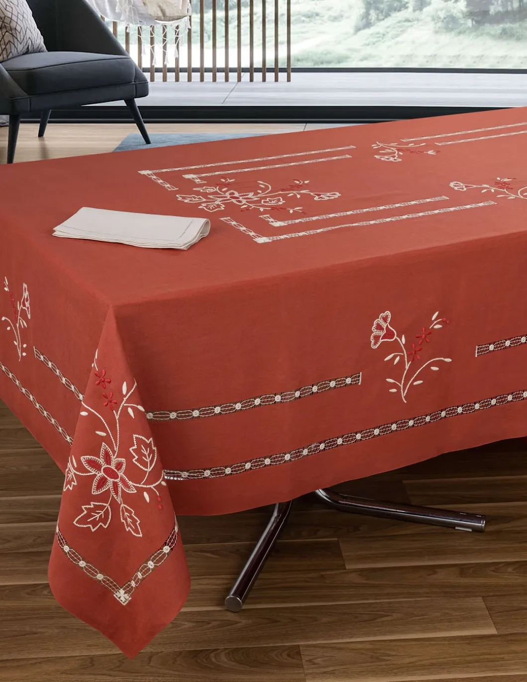 Toalha com os 4 cantos bordados, centro da mesa, laterais e topos.