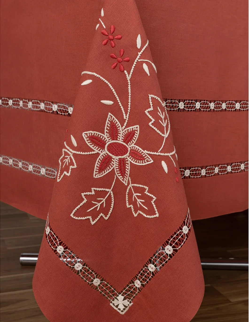 Toalha 100% linho, cor telha. Toalha toda bordada à mão no papelão, com fios de algodão.