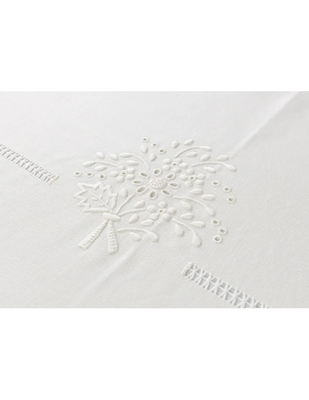 Toalha com os 4 cantos bordados, centro da mesa, laterais e topos.