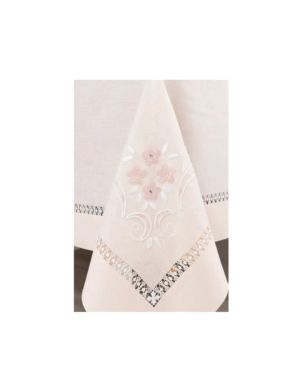 Toalha com os 4 cantos bordados, centro da mesa, laterais e topos.