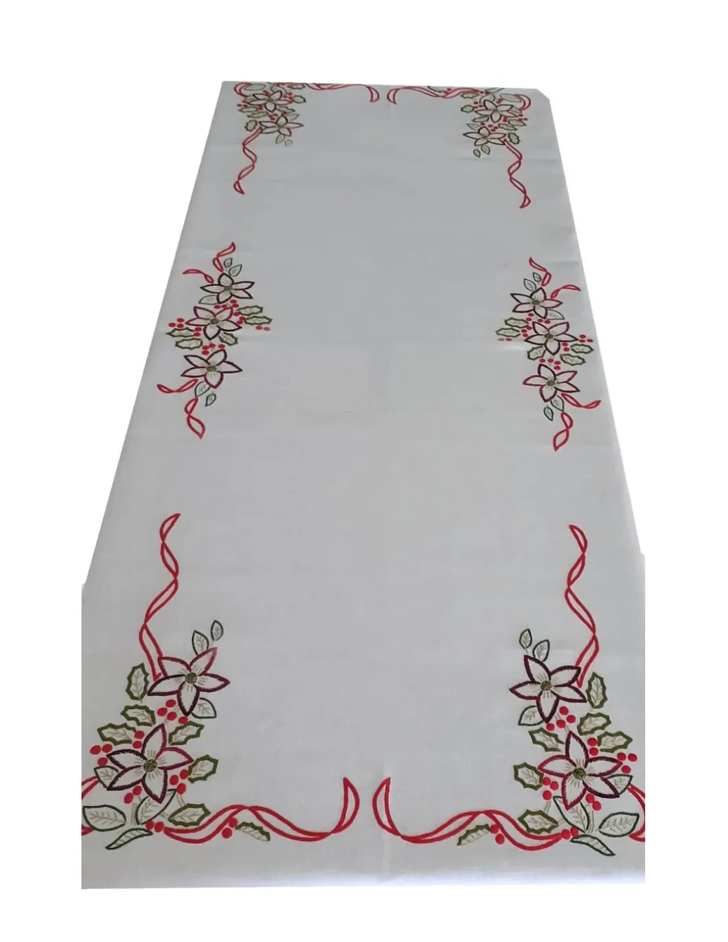 Toalha com os 4 cantos bordados, centro da mesa, esquinas e topos.