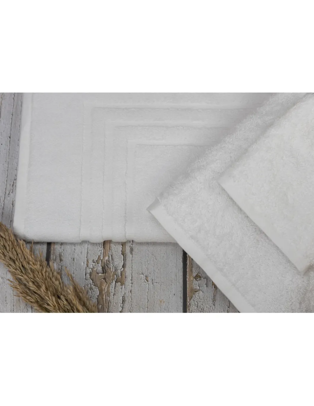 Tapete com 700 gr./m2, desenvolvido especificamente para hotéis, spas e centros de estética, com costura dupla, solidez à lavagem a 60°, fio duplo 24/2 convencional duplo torcido, alta absorção e suavidade.