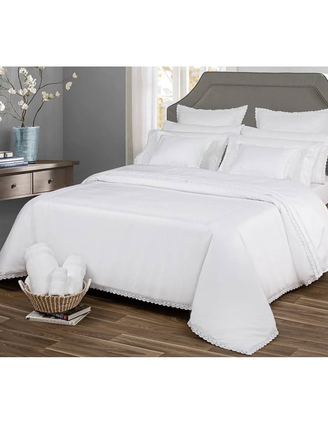 Fina renda aplicada em lençol superior e fronhas nos 2 lados.