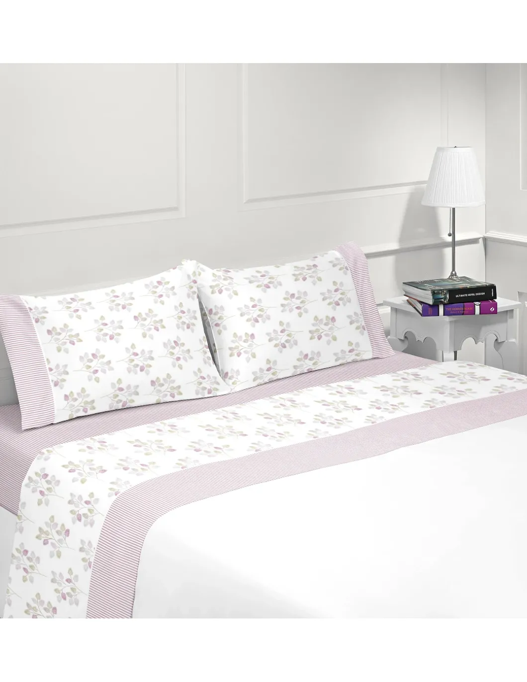 Jogos de lençóis 100% algodão, tons de rosa.